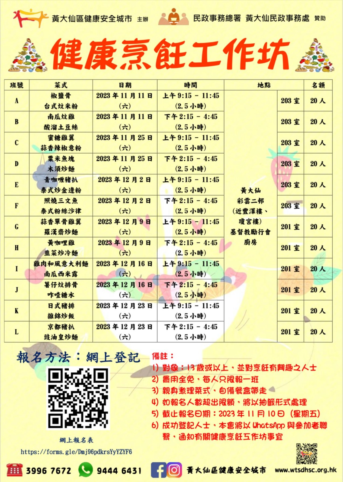 現代人生活繁忙,亦習慣外出用餐,導致不良飲食習慣及忽略了自身健康,本會特意邀請資深導師教授烹飪健康菜式,課程總共有十二個不同菜式的工作坊。導師會示範相關健康烹飪技巧,參加者亦會跟隨導師實踐健康煮食,掌握基本烹調技巧及預備特色菜餚的配製。