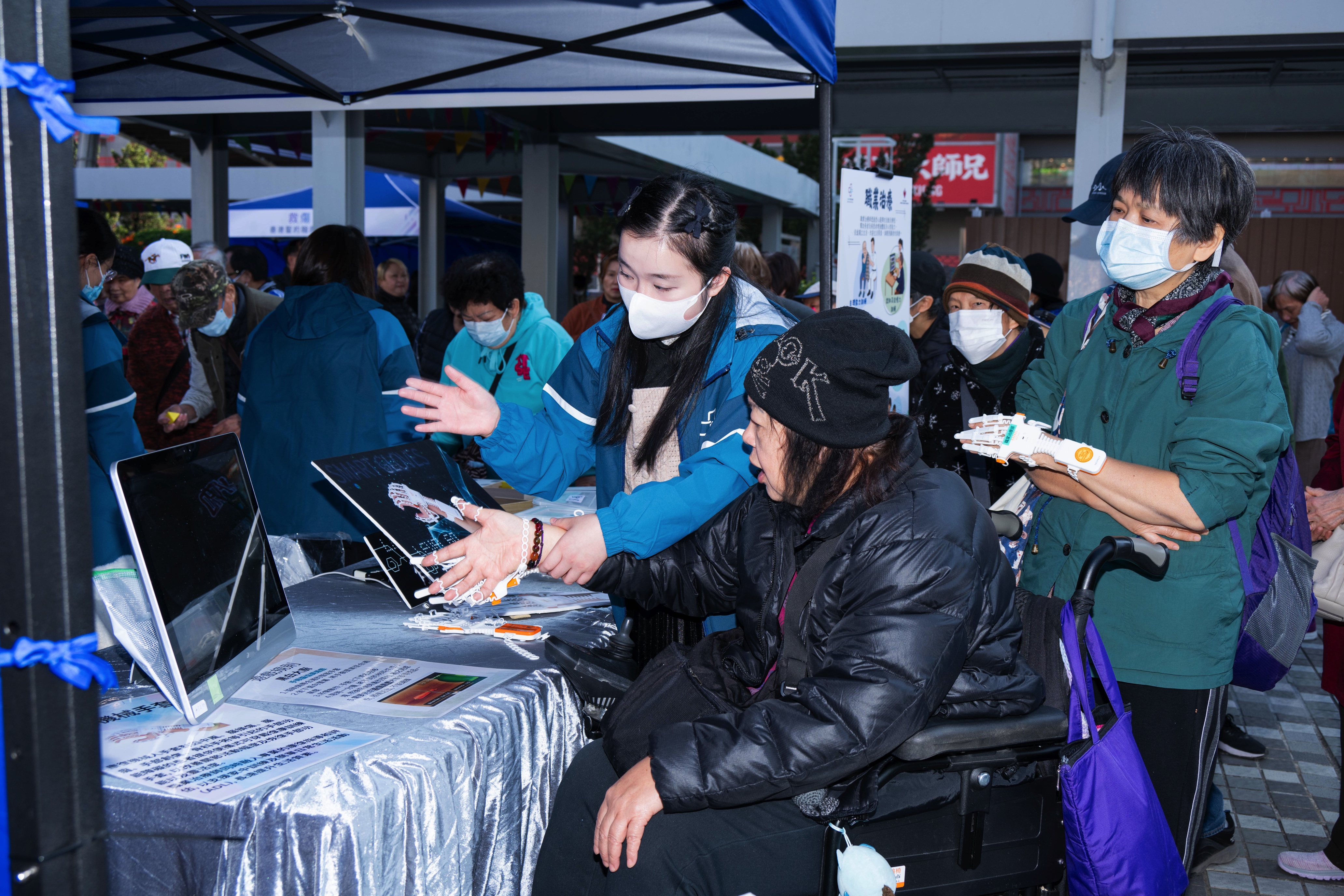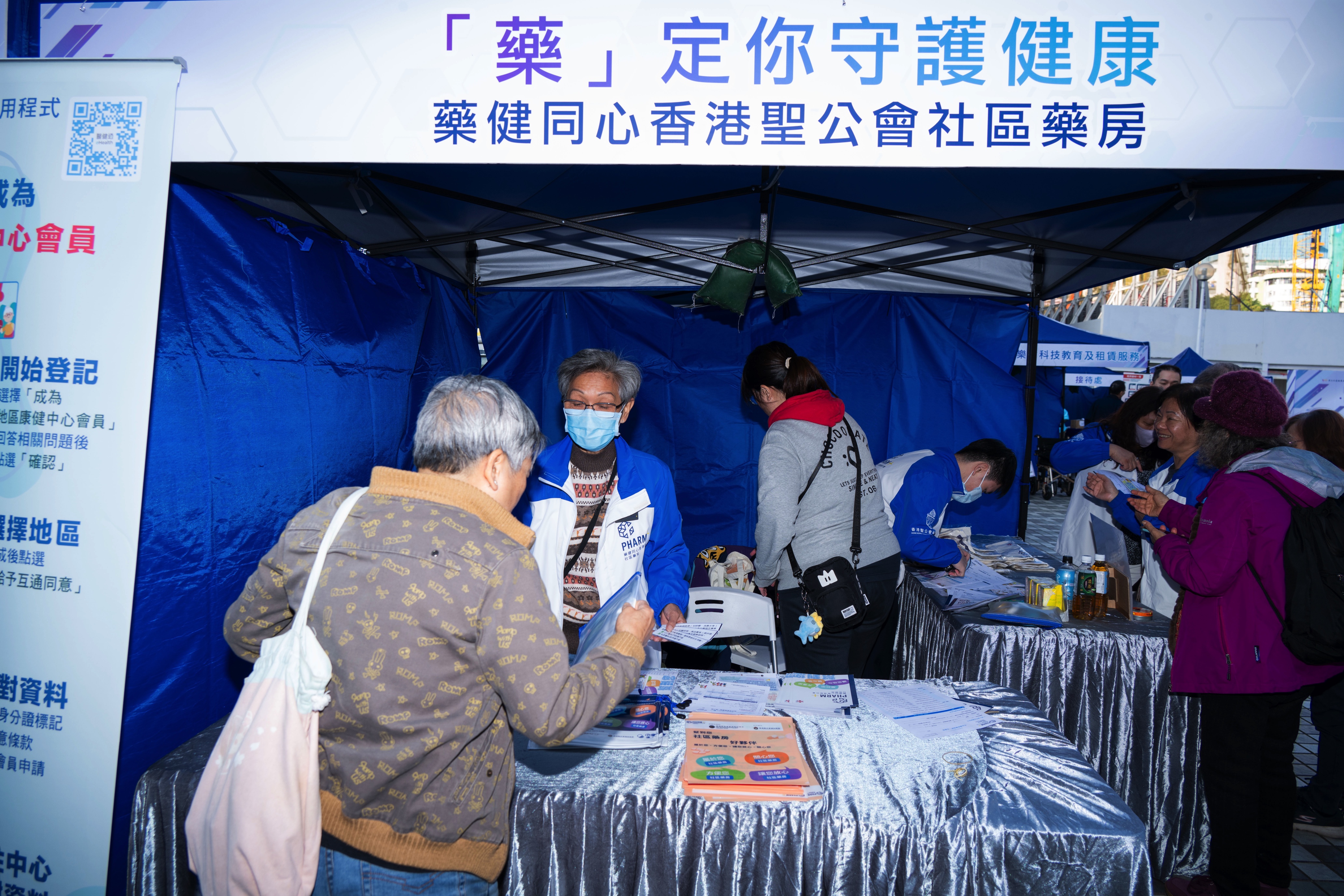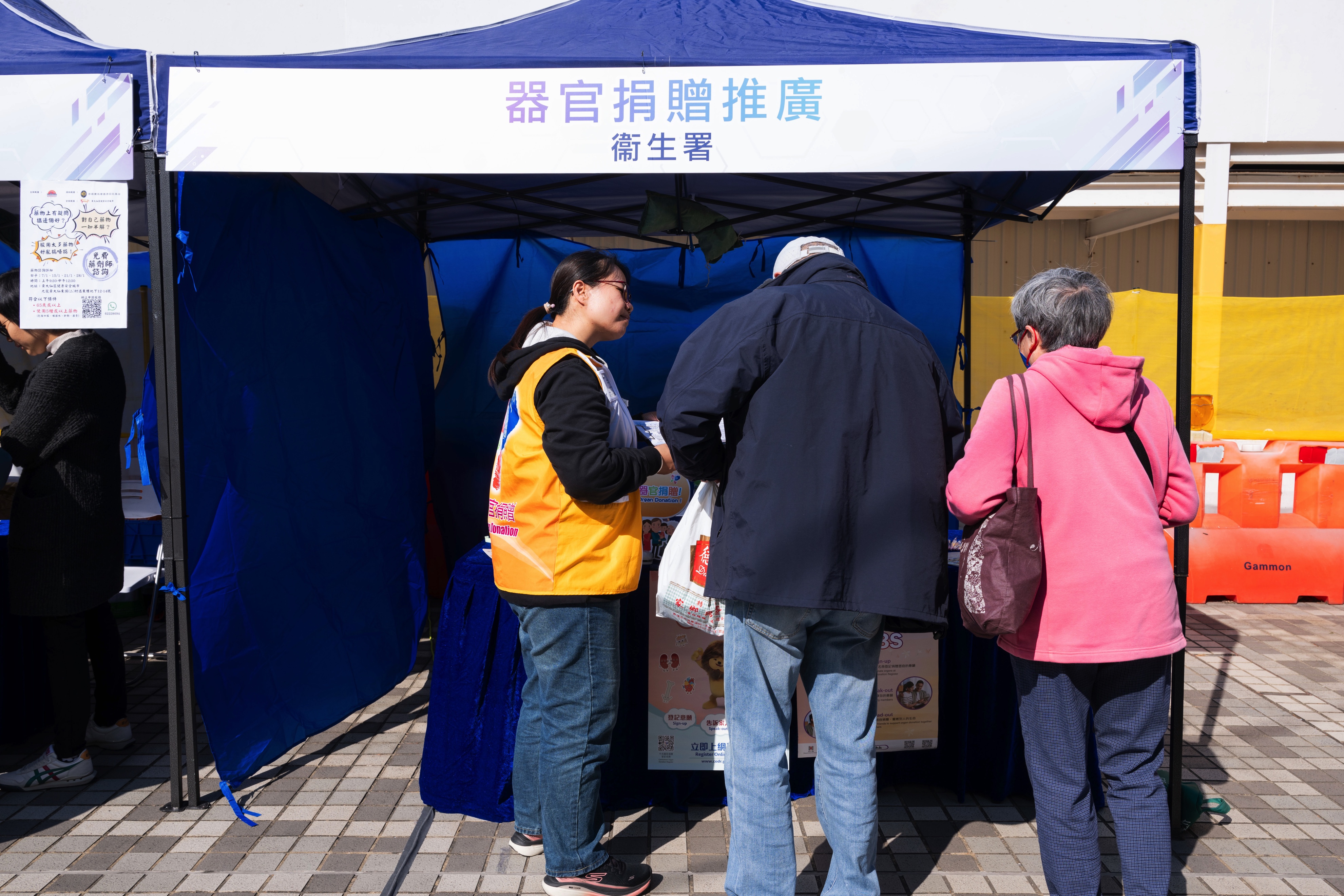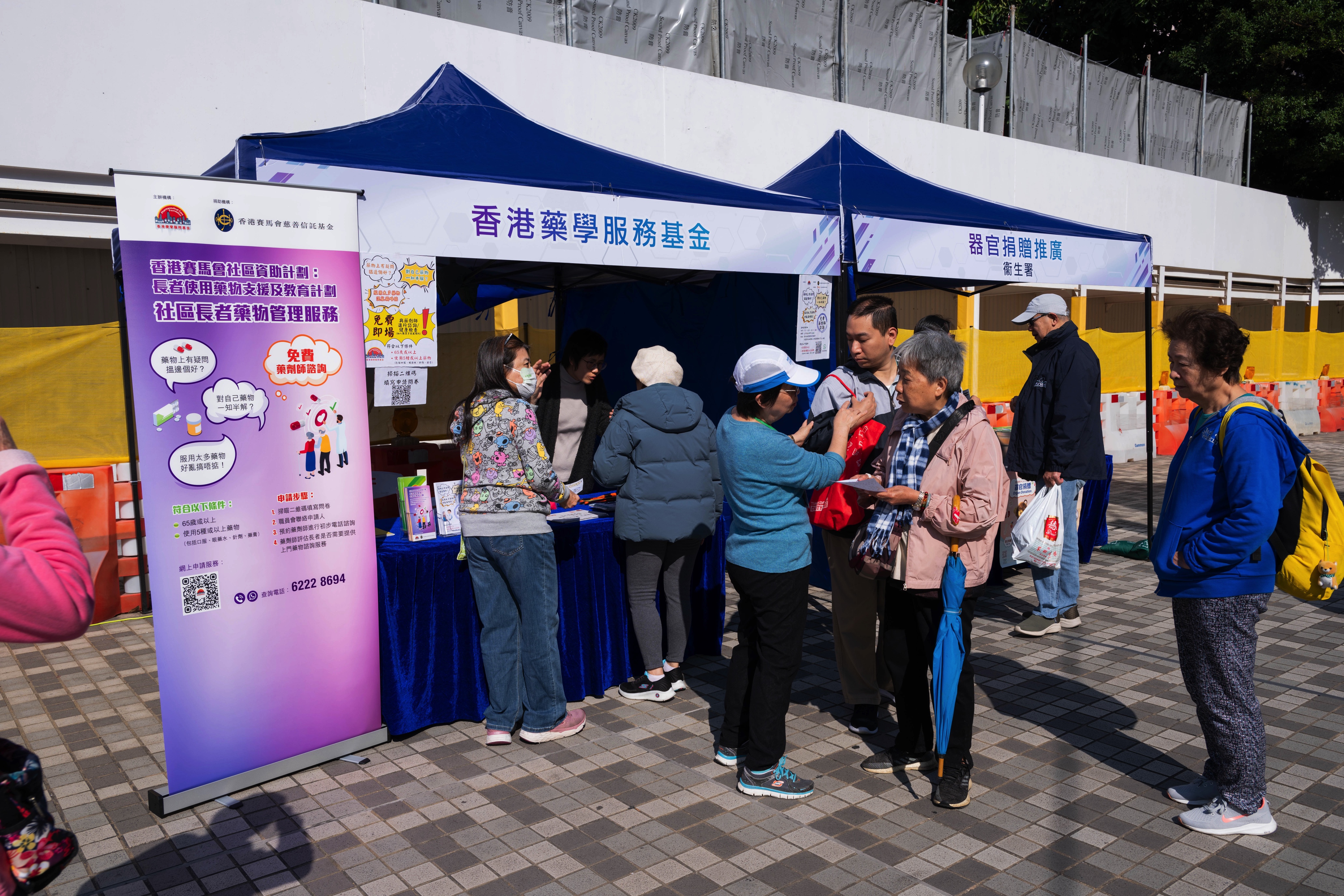 衞生署向居民推廣器官捐贈(圖左),香港藥學服務基金由藥劑師提供簡單的藥物咨詢服務(圖右)
