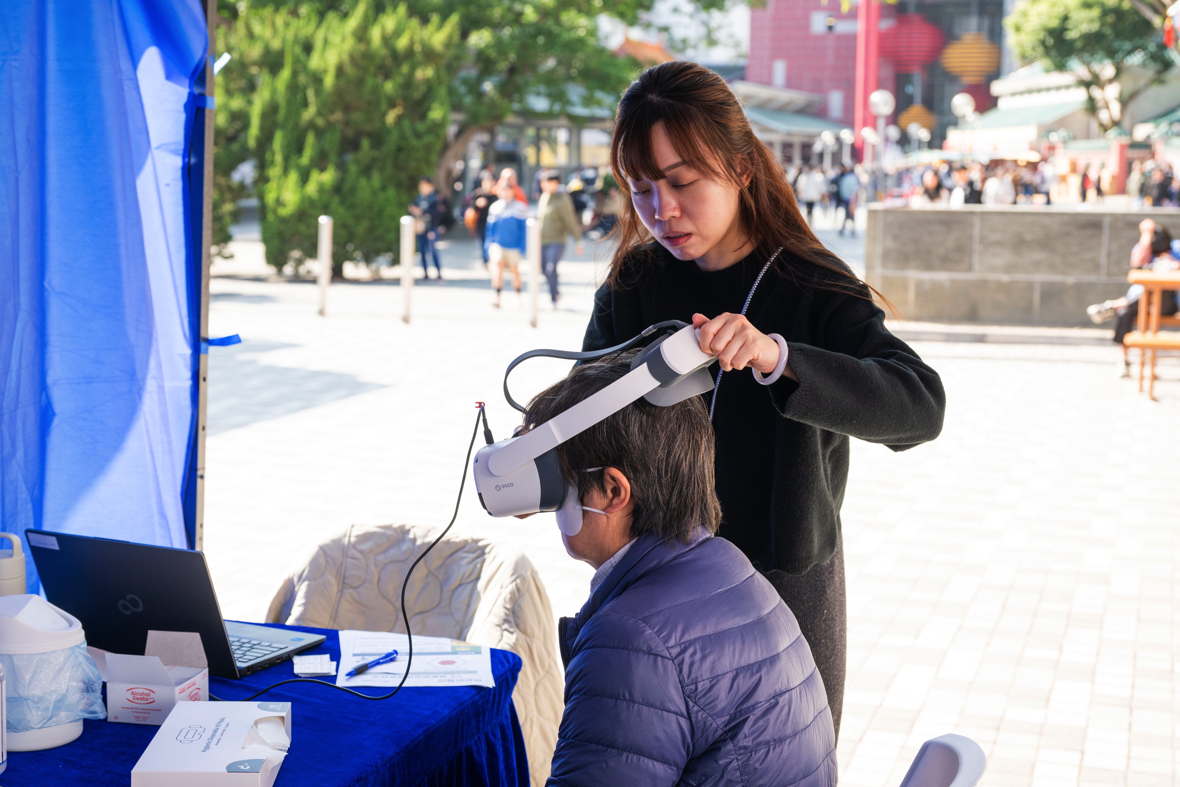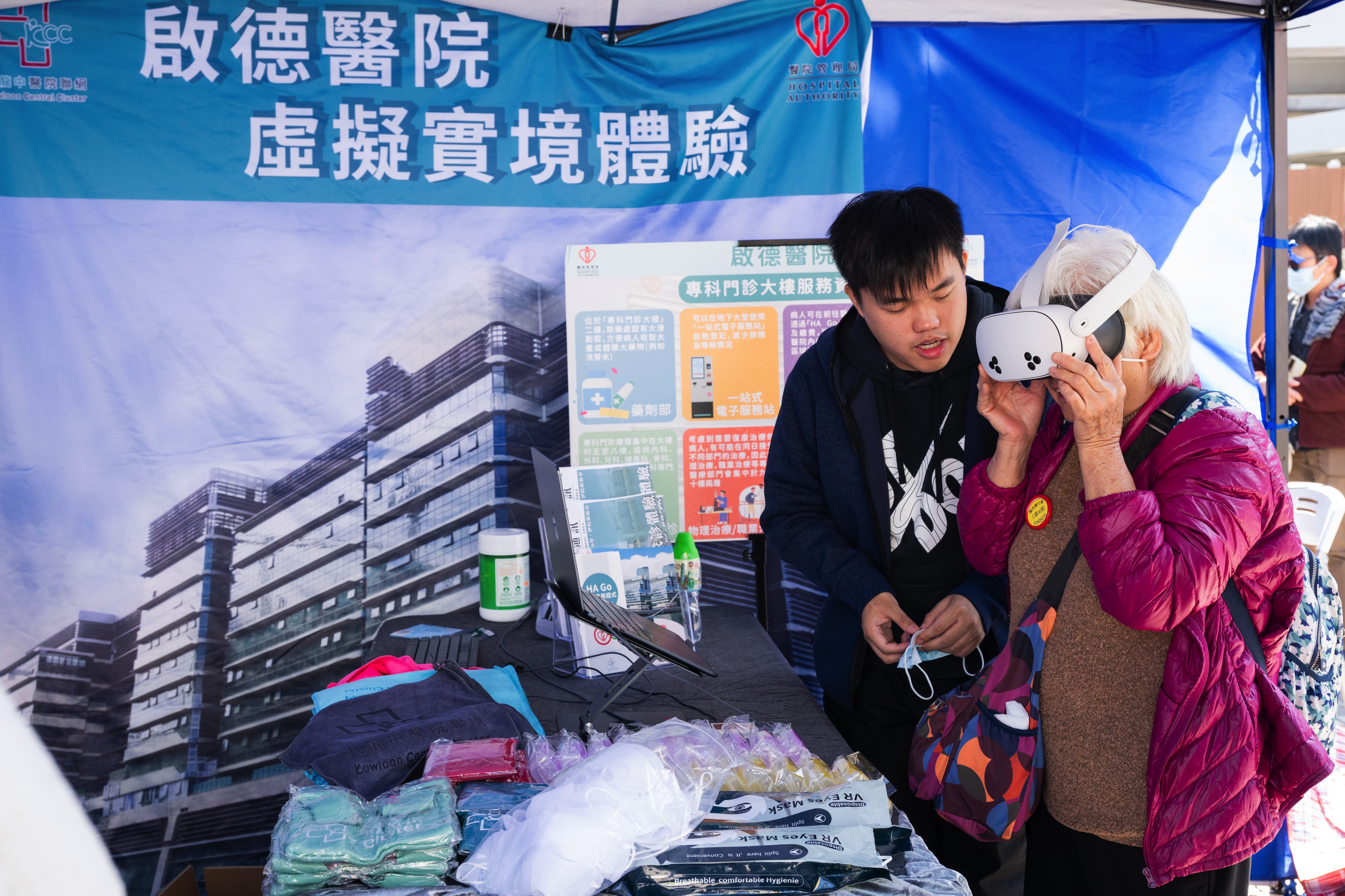 九龍中醫院聯網透過虛擬實景(VR) 讓市民體驗啟德新醫院,亦提供認知刺激健康教育、復康及身體協調訓練等體驗