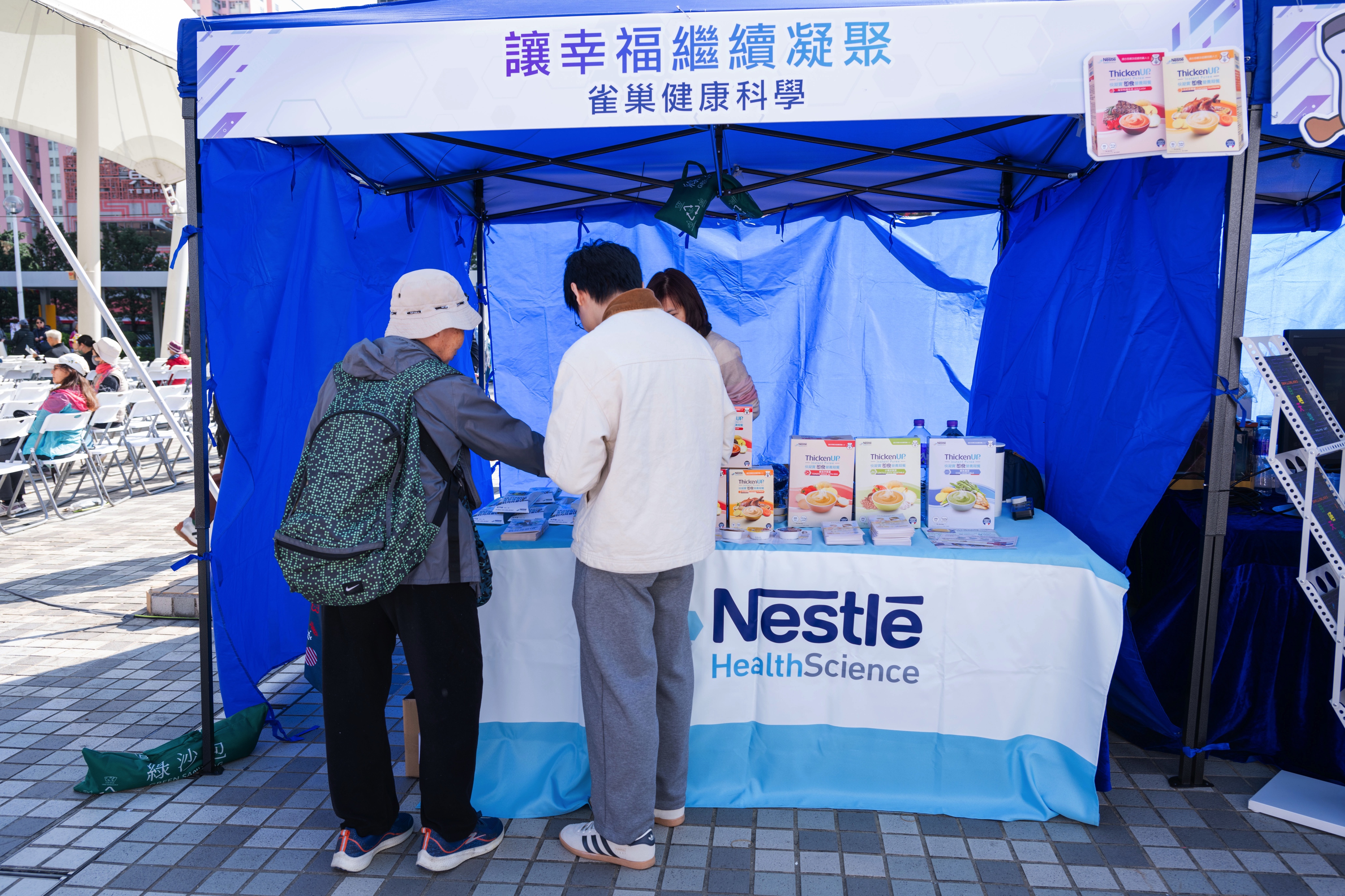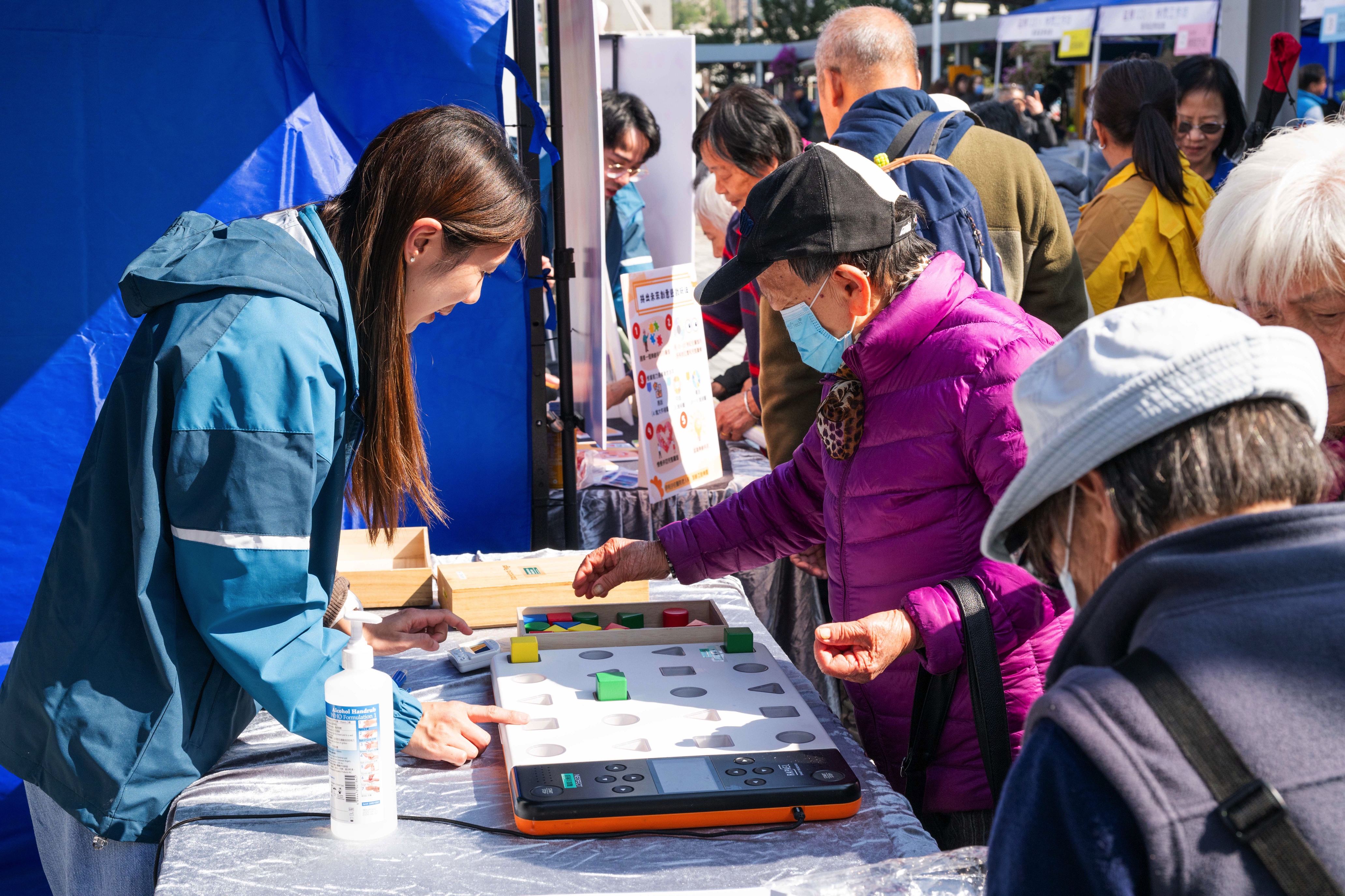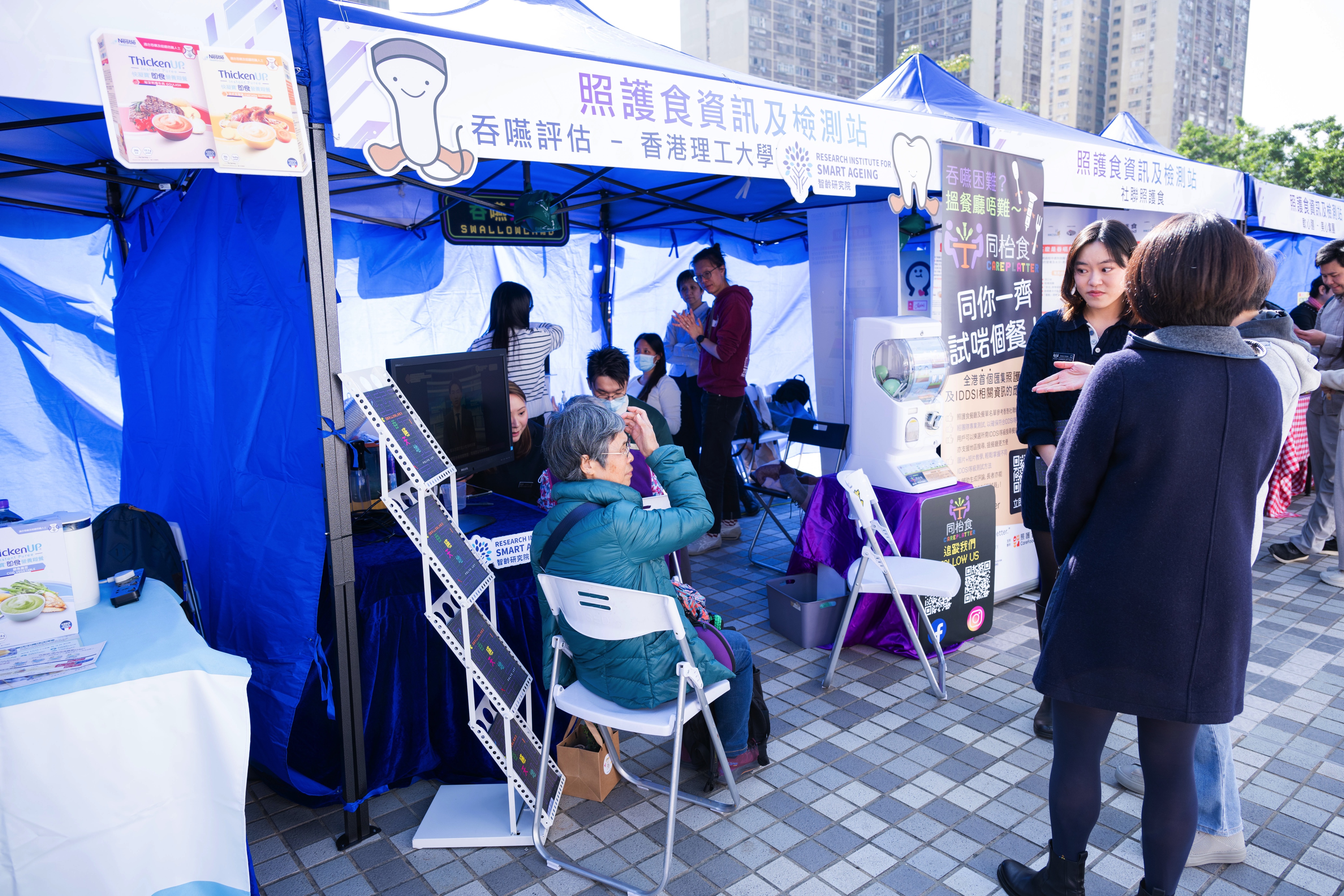 香港理工大學語言科學及技術學系為居民提供吞嚥評估(圖左)、雀巢健康科學教授預防吞嚥困難的運動及凝固粉正確用法教育(圖右)