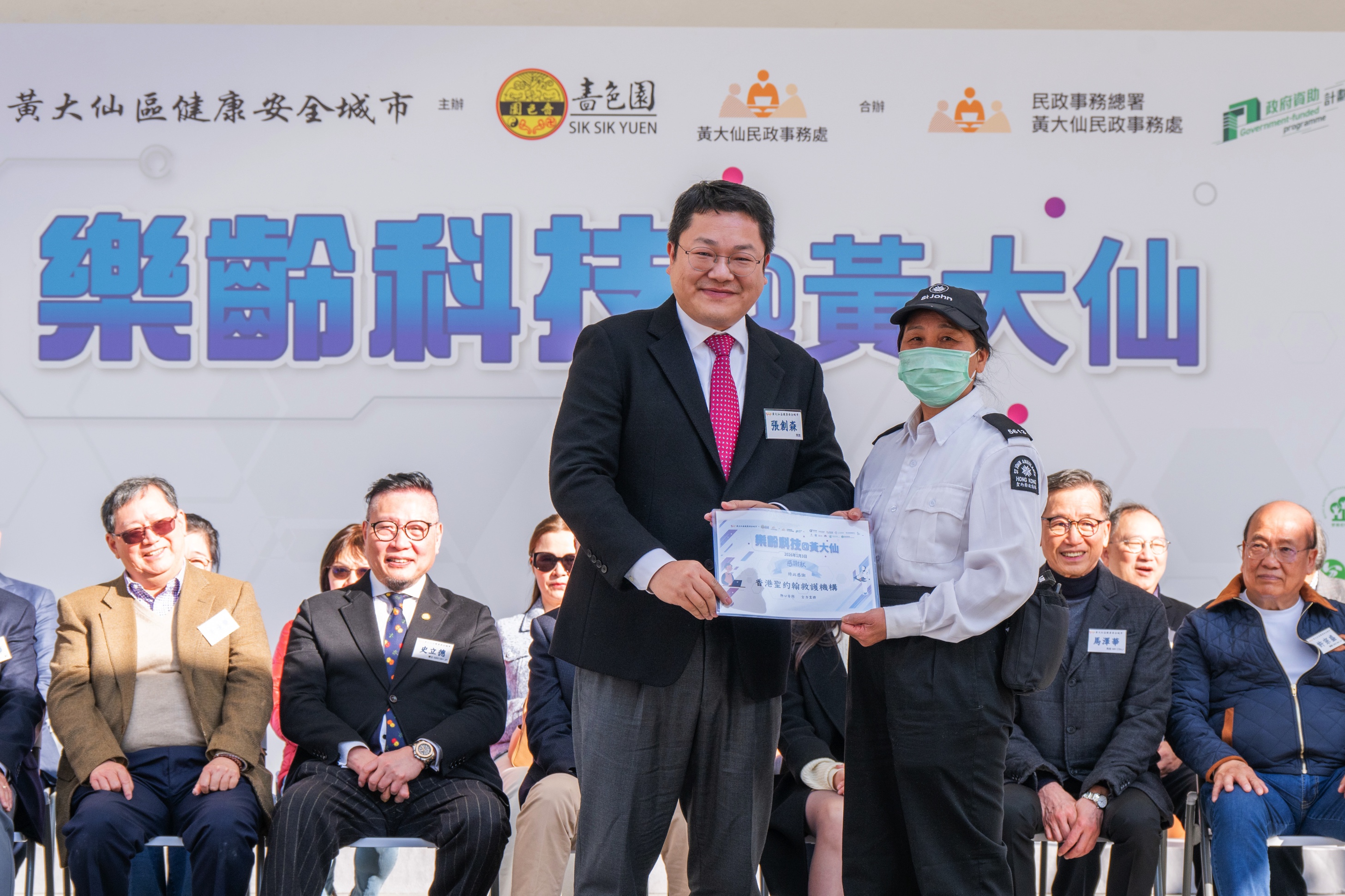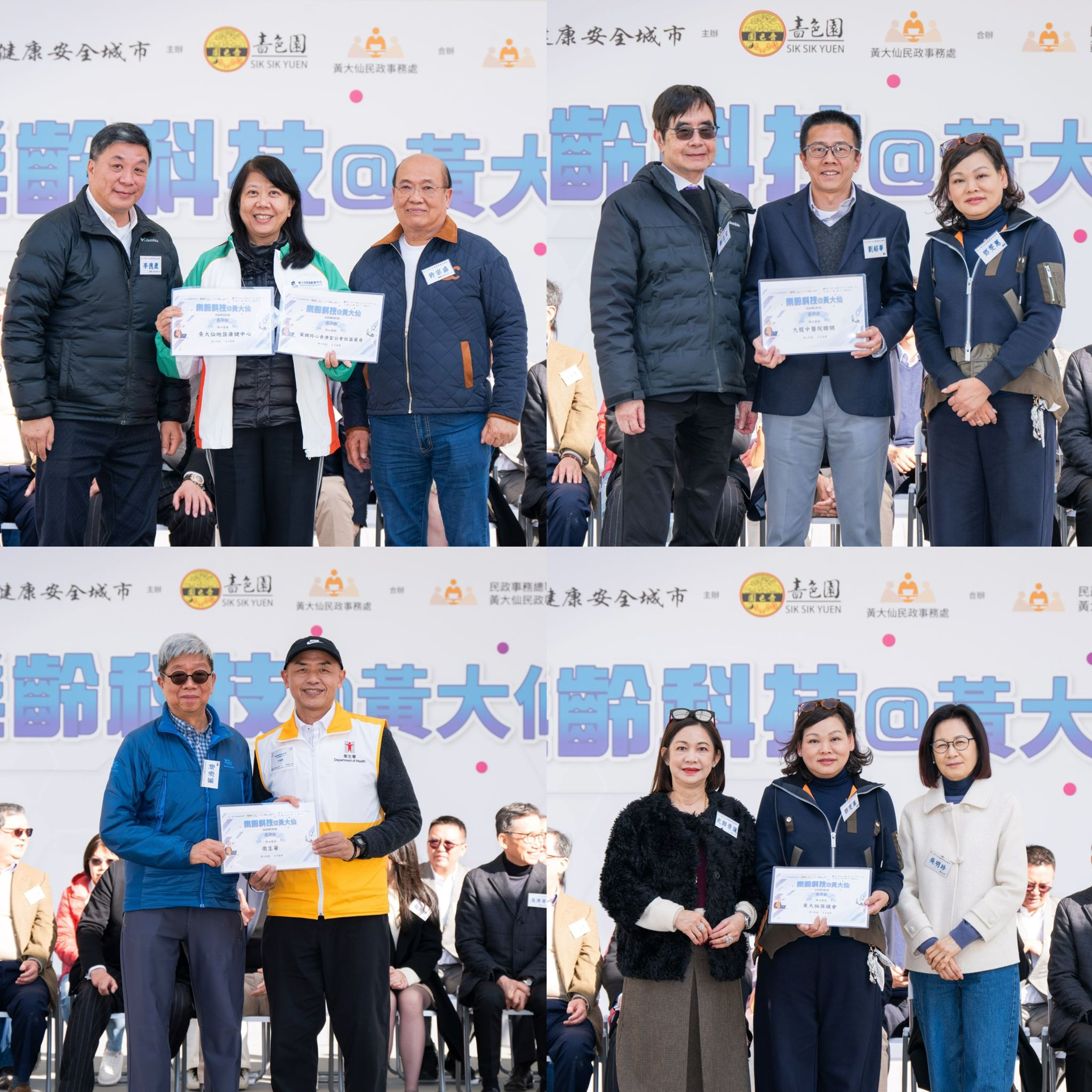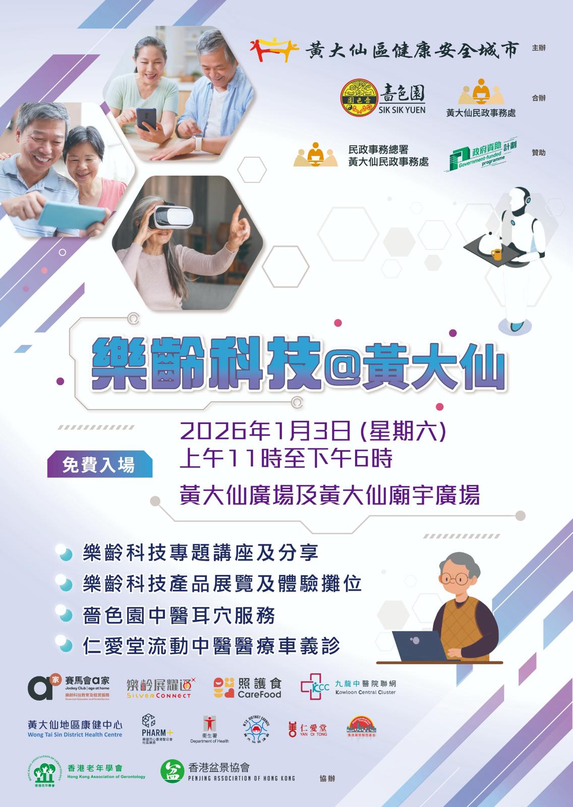 為推廣樂齡科技,增加公眾、長者及照顧者對樂齡科技的認識和應用,由黃大仙區健康安全城市(下稱本會)主辦;嗇色園、黃大仙民政事務處合辦;賽馬會「a家」樂齡科技教育及租賃服務、樂齡展耀通、照護食、九龍中醫院聯網、黃大仙地區康健中心、藥健同心香港聖公會社區藥房、衞生署、黃大仙區議會、仁愛堂、香港藥學服務基金、香港老年學會、香港盆景學會協辦;民政事務總署黃大仙民政事務處贊助的「樂齡科技@黃大仙」已於2026年1月3日圓滿結束。