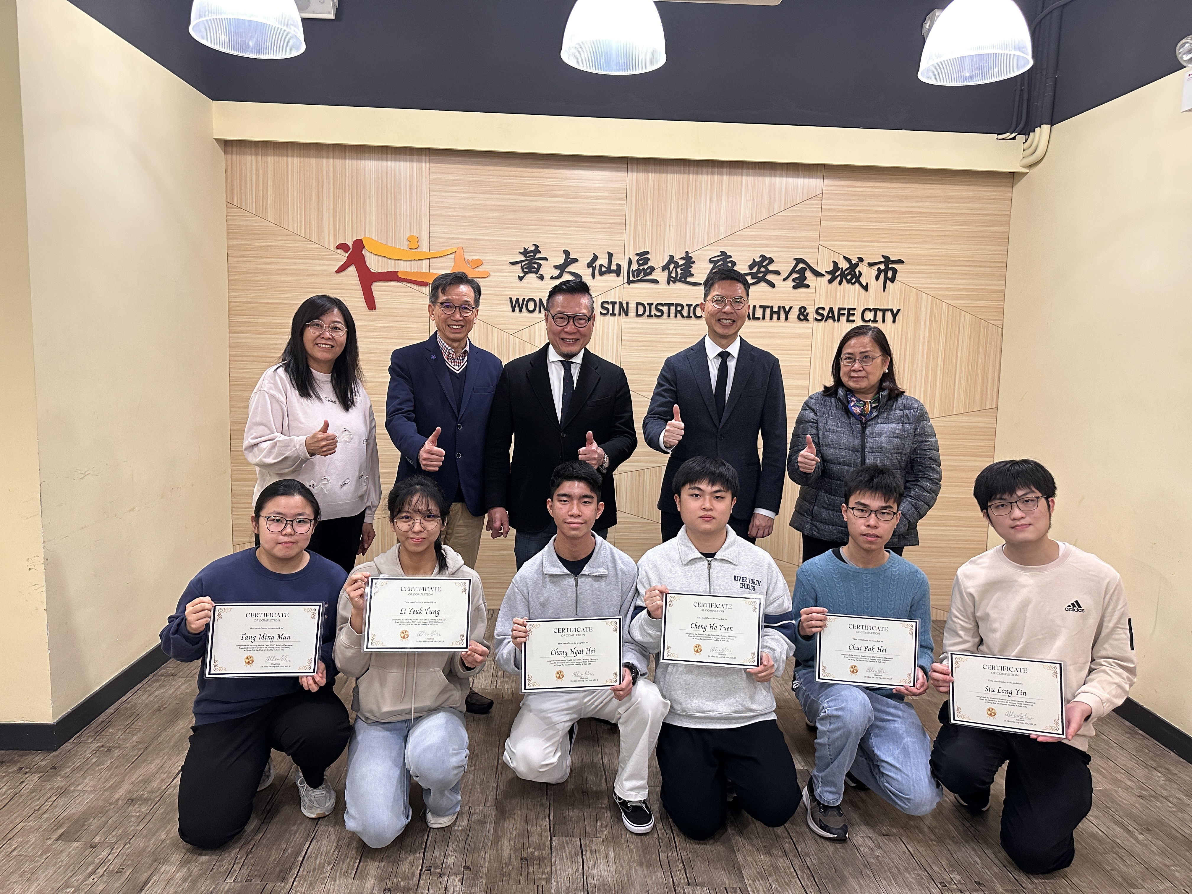 黃大仙區健康安全城市董事局董事 馬澤華先生 MH CStJ到來與學生交流及打氣,同時頒發實習證書予學生