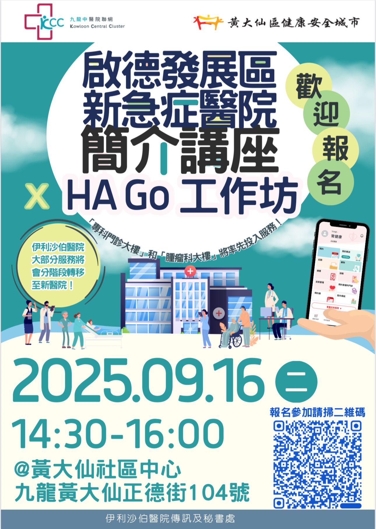 啟德發展區新急症醫院將於2026年開始陸績投入服務,為向居民介紹新醫院的服務及設施、服務轉移安排及HA Go 應用程式,九龍中醫院聯網舉辦「德發展區新急症醫院簡介講座 X HA Go工作坊」。